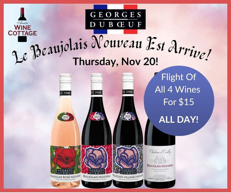 This isn’t just any wine, it’s a global celebration! Since 1982,Georges Duboeuf has brought the magic of Beaujolais Nouveauto the U.S., turning a regional French tradition into aninternational phenomenon on the 3rd Thursday of every November. Crafted from Gamay grapes, this wine is famously fresh, fruity, and irresistibly drinkable.The Art of the Beaujolais Nouveau Label:The Georges Duboeuf Beaujolais Nouveau 2025 label is more than packaging — it’s a celebration of creativity, culture, and collaboration. Since 1983, these iconic labels have been born from a vibrant partnership between the Duboeuf family and the visionary design duo Alain and Dominique Vavro.Every year, wine lovers around the world eagerly await the release of a new label: a vibrant reflection of the wine’s youthful and fresh spirit. The Vavros’ signature graphic style, seen on products for legendary names like Paul Bocuse and Villeroy & Boch, brings a bold, modern flair that perfectly complements the energy of Beaujolais Nouveau.The 2025 label once again features the unmistakable touch of the Vavros, a nod to the timeless appeal of this ever-evolving wine. Beaujolais Nouveau isn’t made to age; and its story, like its label, never gets old.So join us for this yearly party and celebration of a historic tradition of wine! We'll be pouring all 4 wines for $15/flight all day on Thursday, Novemeber 20! Stop in anytime to celebrate!